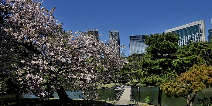 4月「卯月」は、草木が芽吹き、自然の命を感じる美しい季節で、柔らかな陽射しに誘われて、公園・緑地に足が向きます。 浜離宮恩賜庭園も4月1日~5月31日は「区制80周年浜離宮花と緑の集い」実施中で、区内在住者は入園料無料です。 園内に植栽されている桜約100本の内、これまでの春景色の主役ソメイヨシノは盛りを過ぎ、代わって、主として「中の橋」から「海手お伝い橋」までの横堀沿いに植栽されている、所謂「五色の八重桜」と称される個性的な桜群が咲き揃い始めました。 「八重桜」とは、山野に自生している桜の野生種並びに変種とは別に、作出された園芸品種の総称である「里桜」の大半を占めるとされる八重咲き品種の通称名で、「牡丹桜」とも称されます。 「五色の八重桜」とは、花の中心から葉化した1本の雄しべが突き出る様が名の由来とされる、ふわっと柔らかな、白色~淡桃色の「一葉」、花の中心から葉化した2本の雄しべが突き出て先端が反り返った様を、普賢菩薩が乗る象の鼻(牙)に見立てたとされる、薄桃色の「普賢象」、塩漬けは桜湯として用いられる、紅色の「関山」、ショウガ科のウコンの根茎から得られる着色料の色に似る、黄色の「鬱金」、高貴な貴族の衣装の色のイメージから名付けられたとされる、淡緑色の「御衣黄」の5品種です。 花弁が幾重にも折り重なり、ボリューム豊かに咲き誇る様は華麗で、ソメイヨシノとは一味違う趣です。 殊に「海手お伝い橋」傍らの一葉は見事な枝ぶりです。