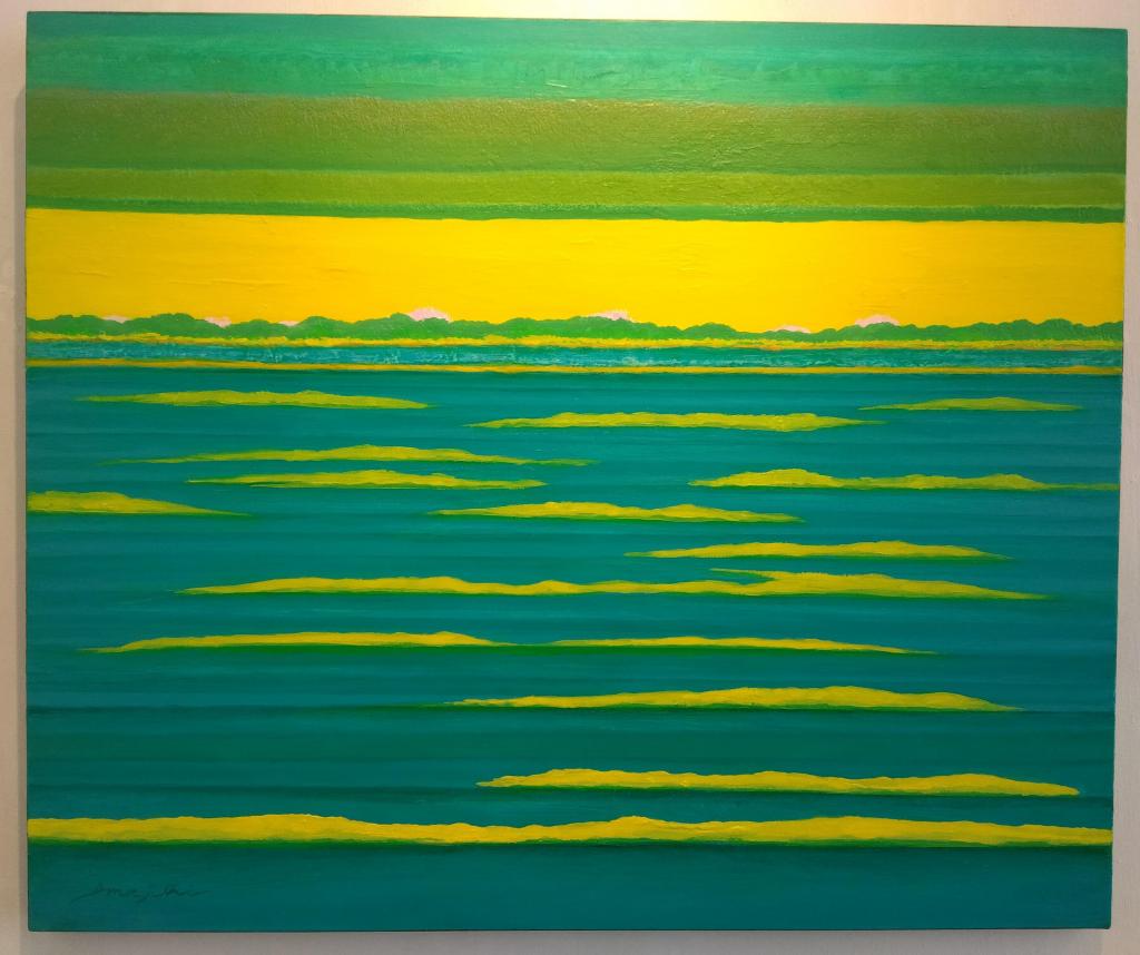 この緑色だけの作品は、よく見ると起伏のある緑豊かな山岳地帯、そしてそこに広がる田園地帯を描いているのかと思います。 本当に奥深いものを考えさせて頂きます。 画廊にお出かけ頂いて、ご自分で感じてください。